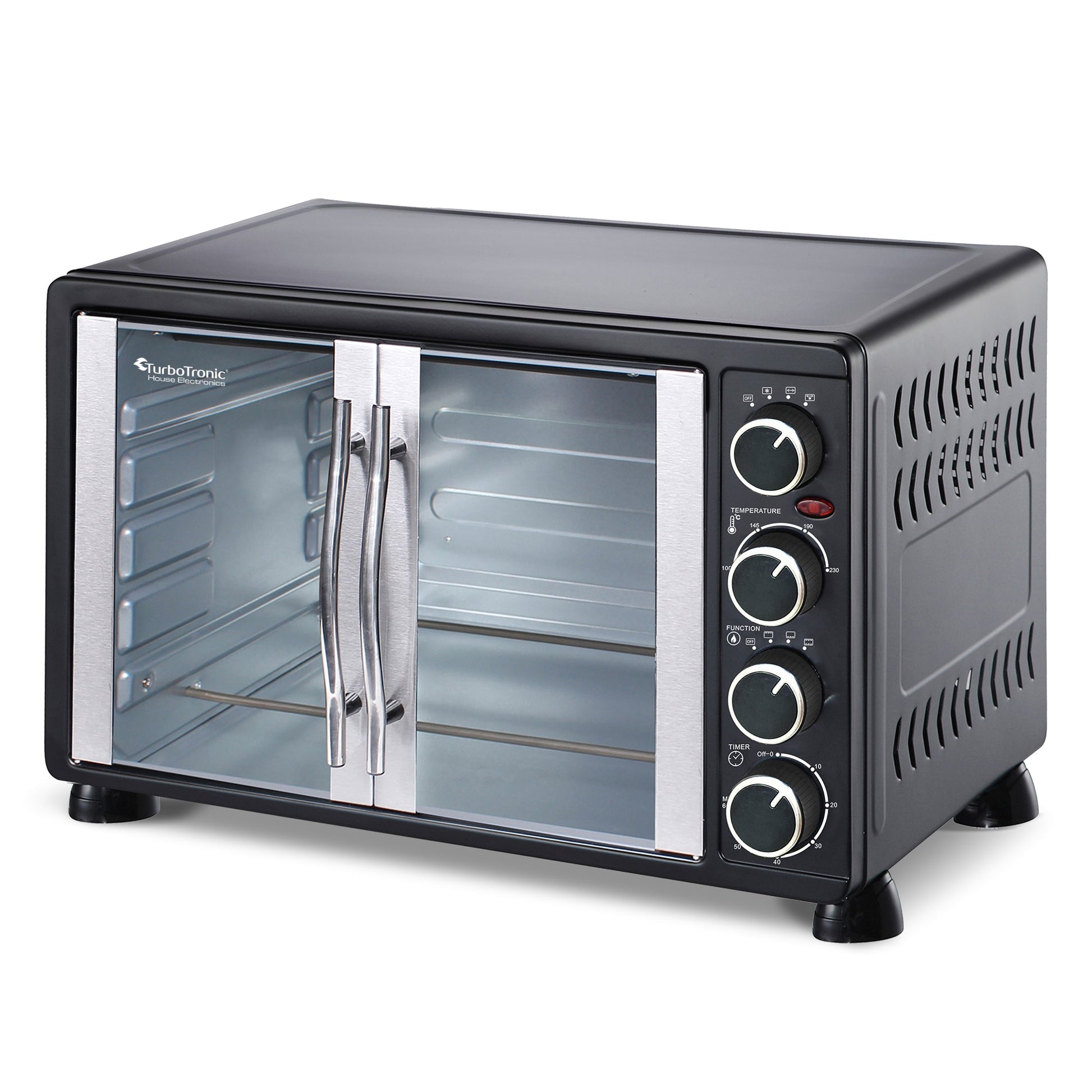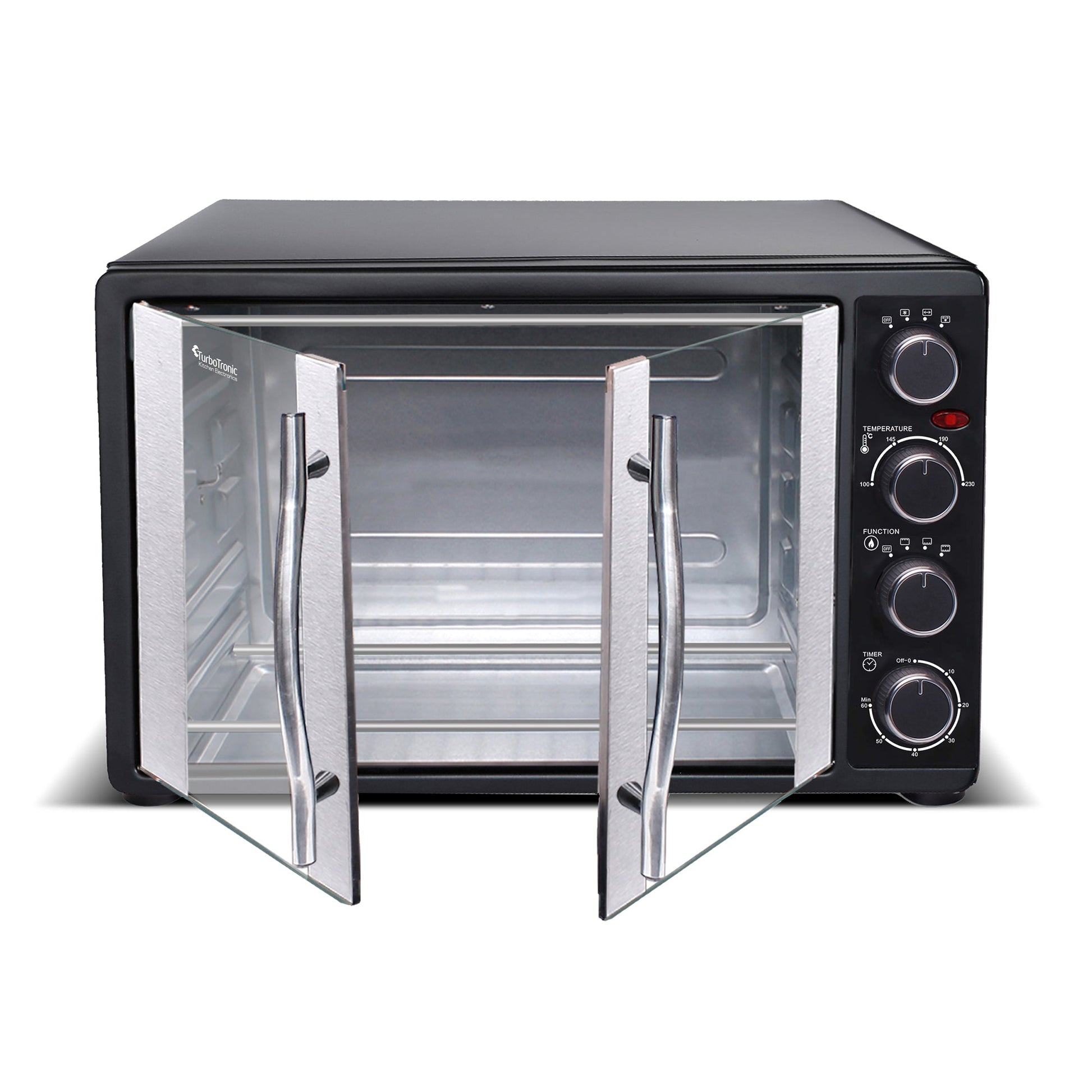 Ce four est conçu avec une attention particulière aux détails. Ses portes françaises et son panneau avant noir apportent une touche d'élégance, tandis que les cadres de porte en acier inoxydable ajoutent une note de modernité. Vous trouverez sur le panneau de commande quatre boutons pratiques :