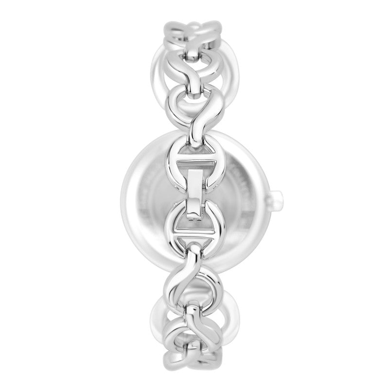Avec un cadran à la largeur et à la hauteur de 33 mm, et une épaisseur de seulement 10 mm, elle se porte avec aisance et confort au poignet. Son bracelet en métal argenté est ajustable, pouvant aller d'une longueur de 16 à 20 cm, pour s'adapter parfaitement à différents styles et préférences. La largeur de 12 mm du bracelet offre une présence subtile tout en restant féminine.