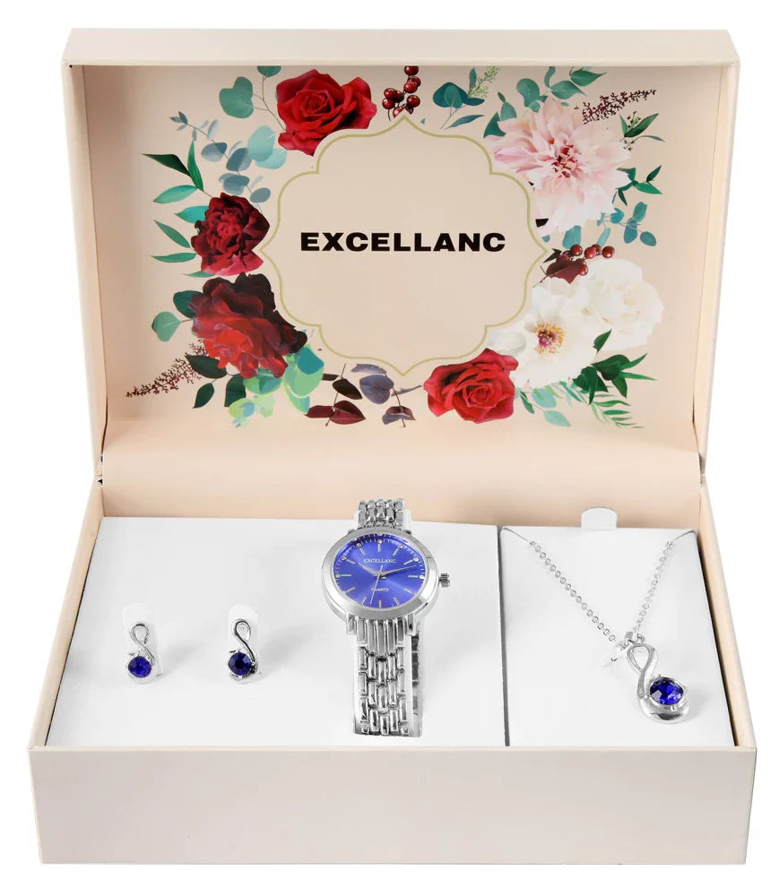 Coffret cadeau Excellanc pour femme avec 1 montre Strass + 1 collier + 1 paire de boucles d’oreille /