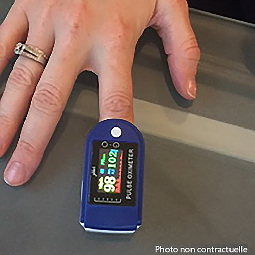 - L’oxymètre de pouls permet de mesurer le taux de saturation du sang en oxygène ainsi que la fréquence cardiaque.